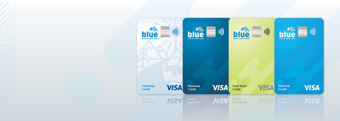 Blue ofrece cuatro tarjetas de crédito Visa® exclusivas que no vienen con tarifas y tarifas escandalosas. Con todas las tarjetas de Blue, disfrutará de: